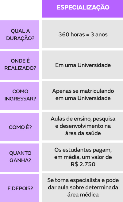 Nesse módulo, o recém-formado em medicina se matricula em alguma universidade para realizar a especialização, que funciona como uma pós graduação. Ela aprofunda o conhecimento teórico, prepara o médico para a atuação acadêmica e dá oportunidade para a participação em pesquisas que visam a evolução da área estudada.
